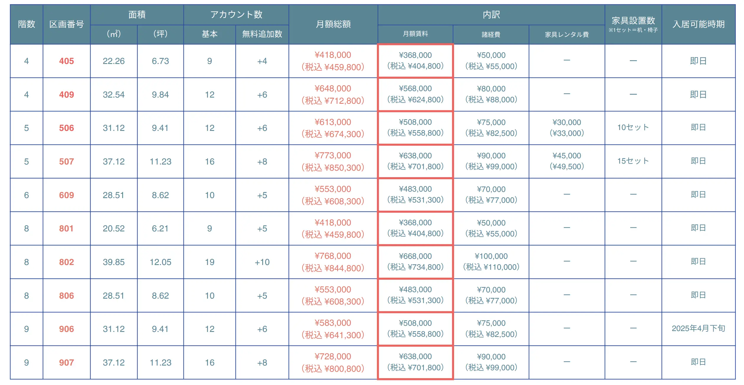 備考:定期借家契約(2年間)、再契約事務手数料(賃料の1ヶ月)、保証会社必須(賃料+諸経費の1ヶ月)、火災保険必須、原状回復義務有り、社名表示作成料有り(2025年5月1日までの契約開始に限り免除)、同居法人の登記可能(席数上限内に限る)、フリーレント2ヶ月(2025年5月1日までの契約開始に限る)
