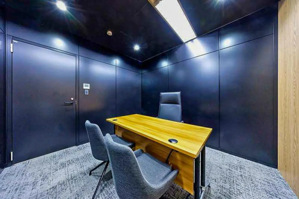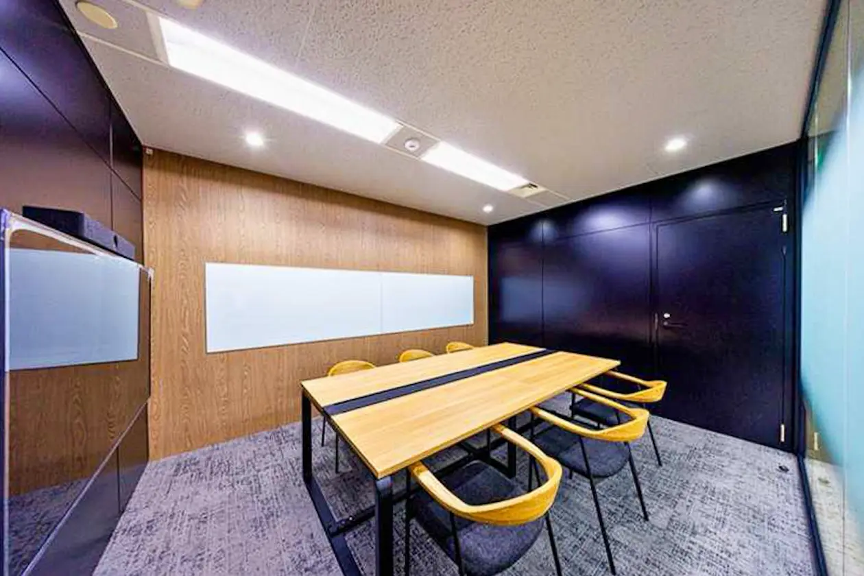 ブラックで統一された壁面と天井が、空間全体に重厚感をもたらす一室。約2〜4名規模で利用可能なサイズ感で、役員室としてはもちろん、重要な商談や採用面接、機密性の高い会議にも適しています。