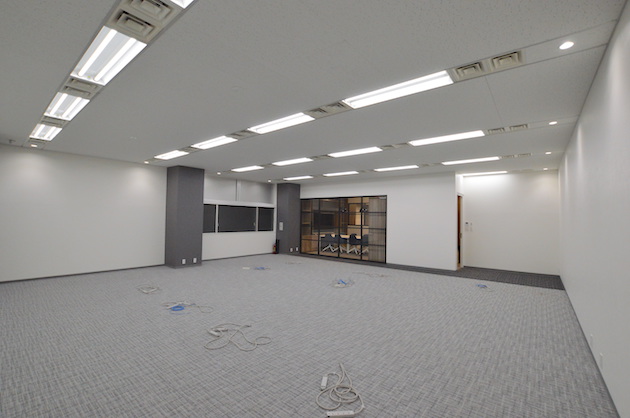 ただ、統一された中にもラウンジとカーペットの仕様を変えてビジネスを意識した空間に仕上げるなど、デザイナーの細かいこだわりが垣間見えるというのがこちらの物件のニクいポイント。こちらがメインルームとなる事務室。ラウンジや会議室とは打って変わって、モノトーンで統一されたシンプルなオフィスといった印象です。天井は約3Mの高さ。最低20人のワークスペースは確保できそうな広さがあります。