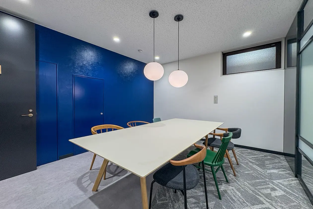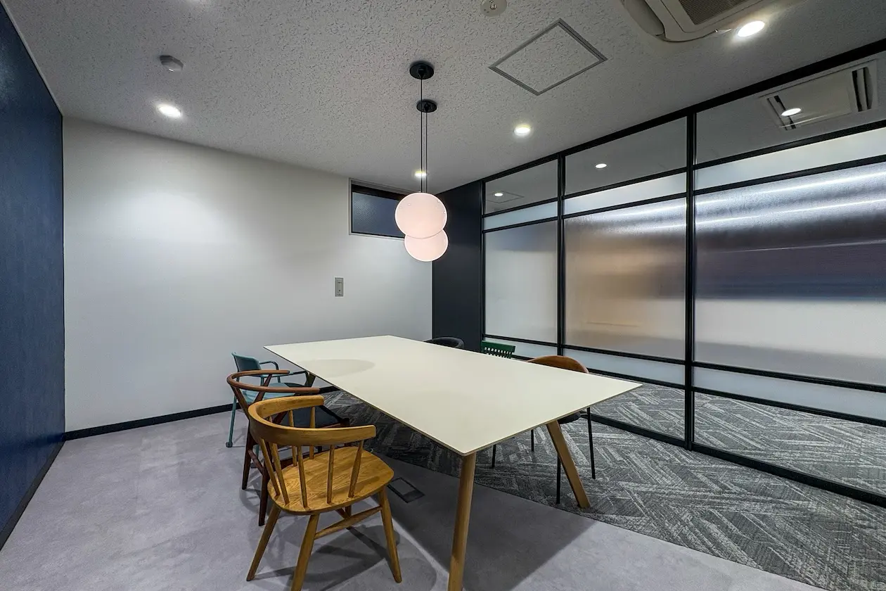 ペンダントライトのやわらかな光がテーブルを優しく照らし、長時間の打ち合わせでもストレスを感じさせない空気感を演出しています。