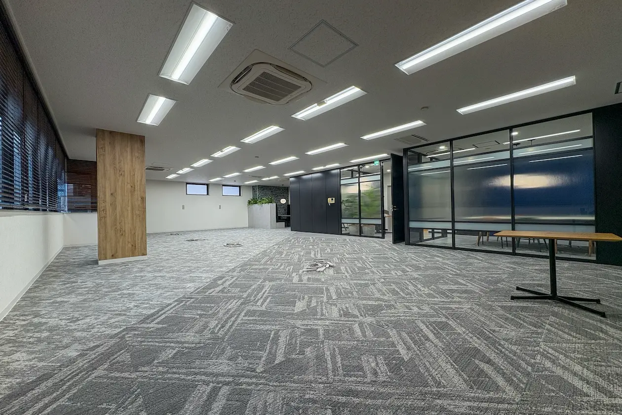 床一面にはグレートーンのカーペットタイルが敷かれ、視覚的にも空間が広く感じられるデザインとなっています。