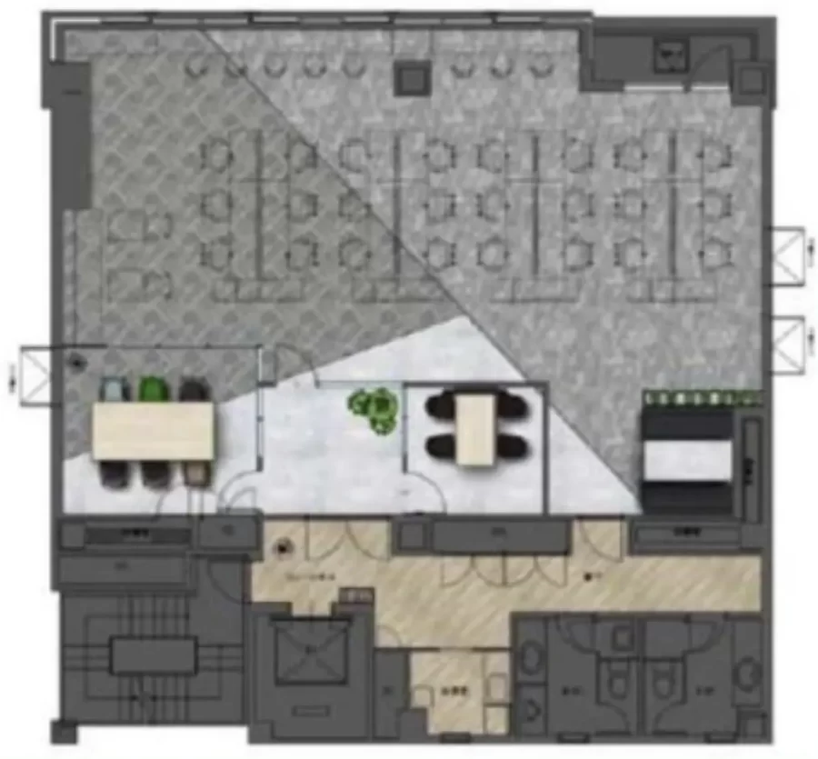 窓面はワイドに確保されており、ブラインド越しに柔らかい光が届くため、長時間のデスクワークでもストレスを感じにくい明るさをキープ。20〜25名規模のオフィスはもちろん、部署ごとの島を複数つくるレイアウト、執務とフリースペースを併用した構成など、多彩な働き方に対応できます。