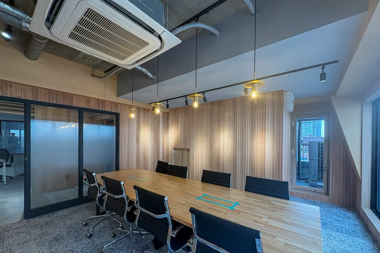 木目の壁材とペンダント照明が印象的で、来客時にも誠実な印象を与えられる空間です。