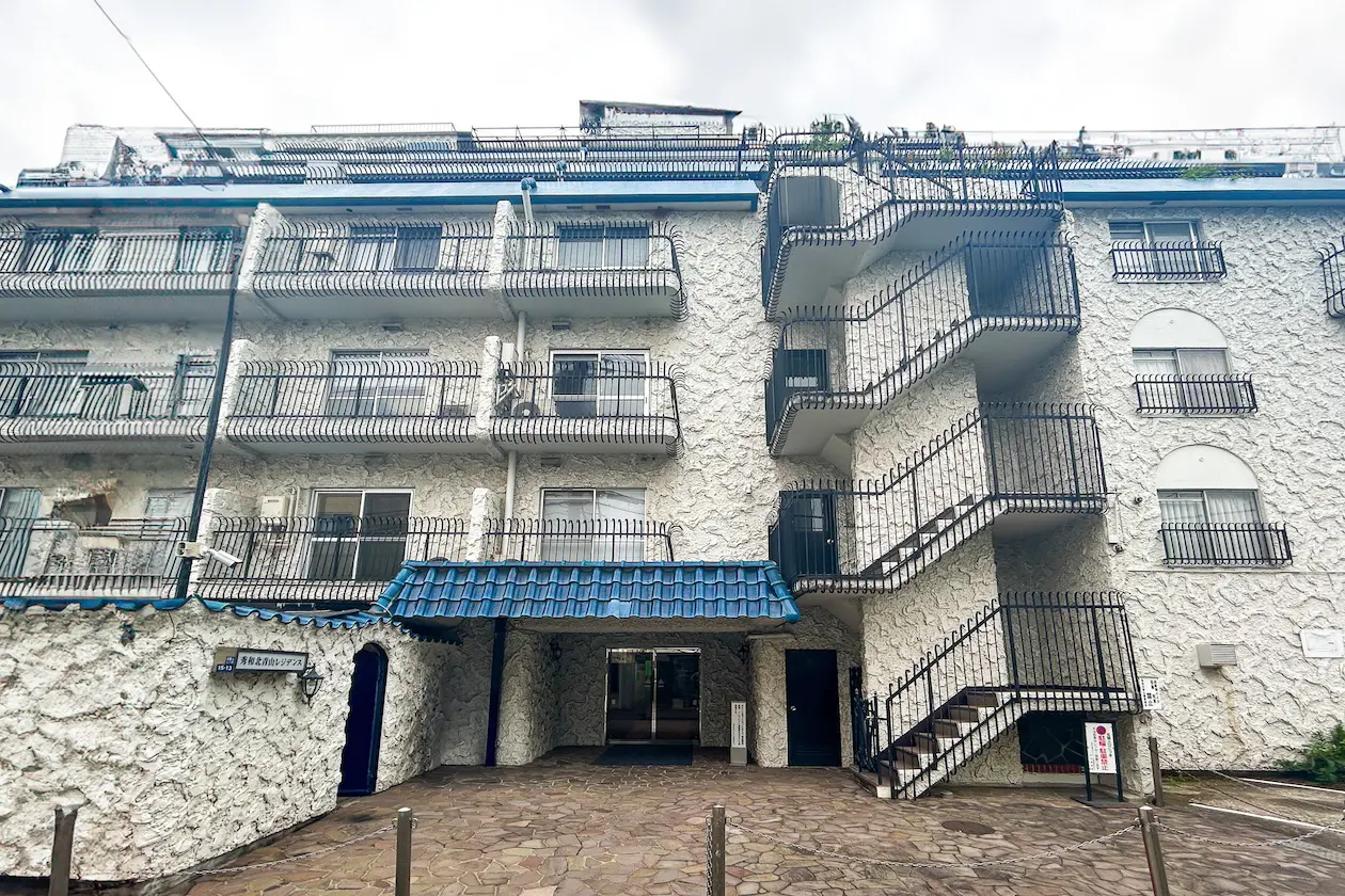 南ヨーロッパ調の白い外壁と青い屋根の爽やかな外観のヴィンテージマンション。