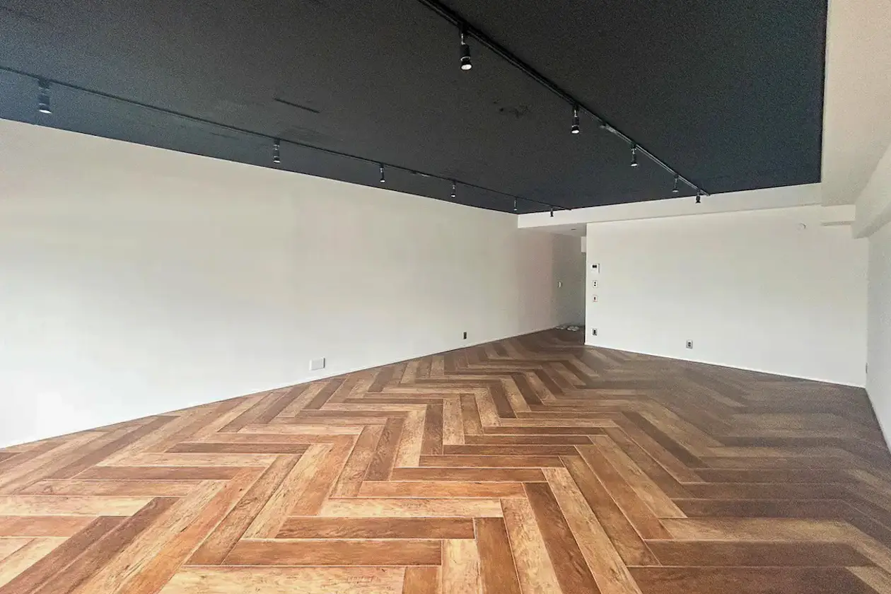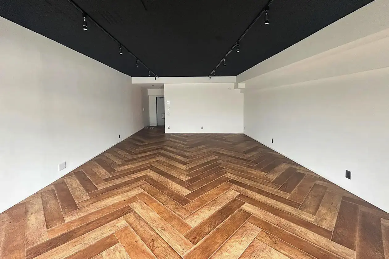 室内はモノトーンライクに映えるヘリボーン調の床のシンプルなデザイン。