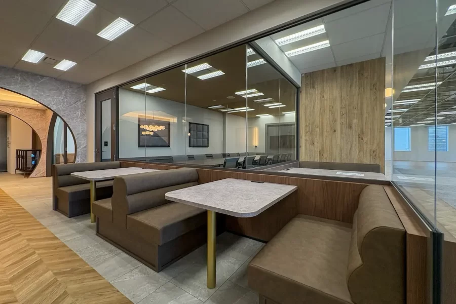 ファミレスブースも設置済みなので、気分を変えてのワークスペースやライトなミーティングも行うことが可能だ。