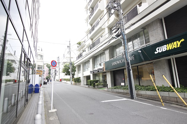 横断歩道を渡って直進、つきあたりを左折したところに位置しています。駅からの道順はとてもわかりやすく、外観も存在感があり人目を惹くので来客の際もご案内がしやすそうです。駅徒歩2分というアクセスの良さに加え、物件や駅周辺には飲食店が点在しているのでランチや食事に困りません。