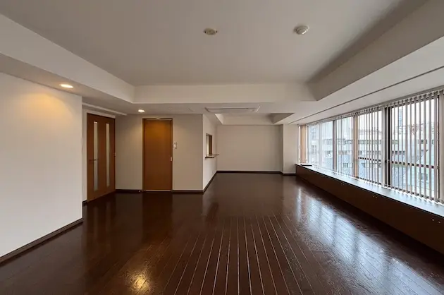 ダークブラウンのフローリングが空間全体に落ち着いた上質感を与える、ゆとりのあるメインルームは約24畳。