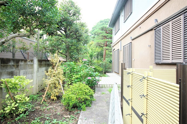 建物正面向かって左側には庭があります。