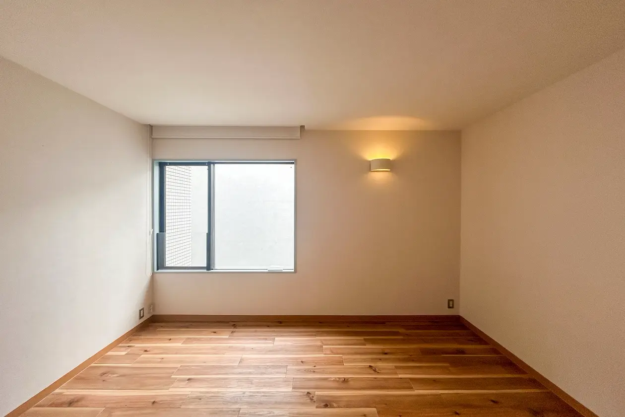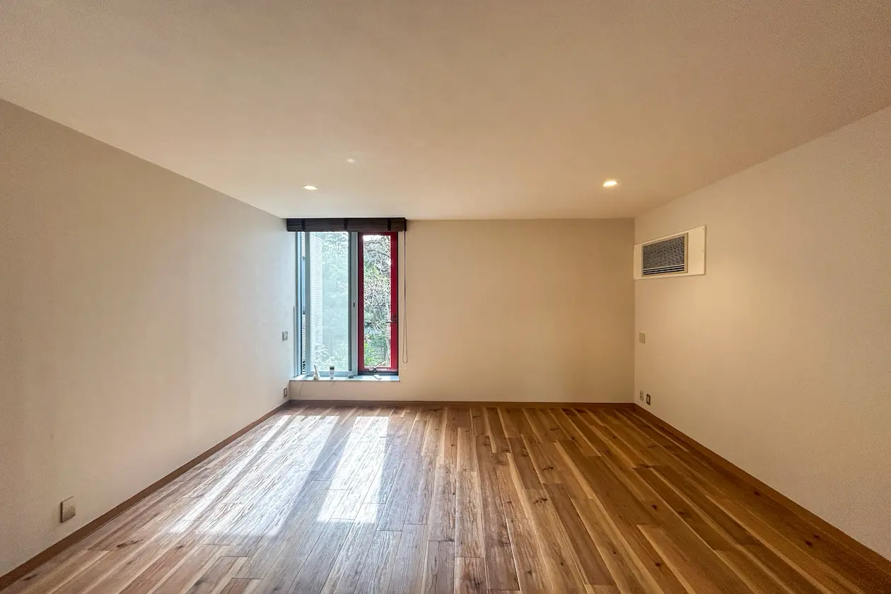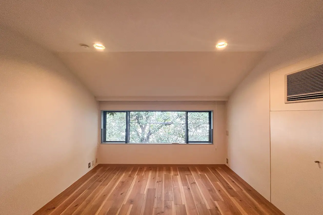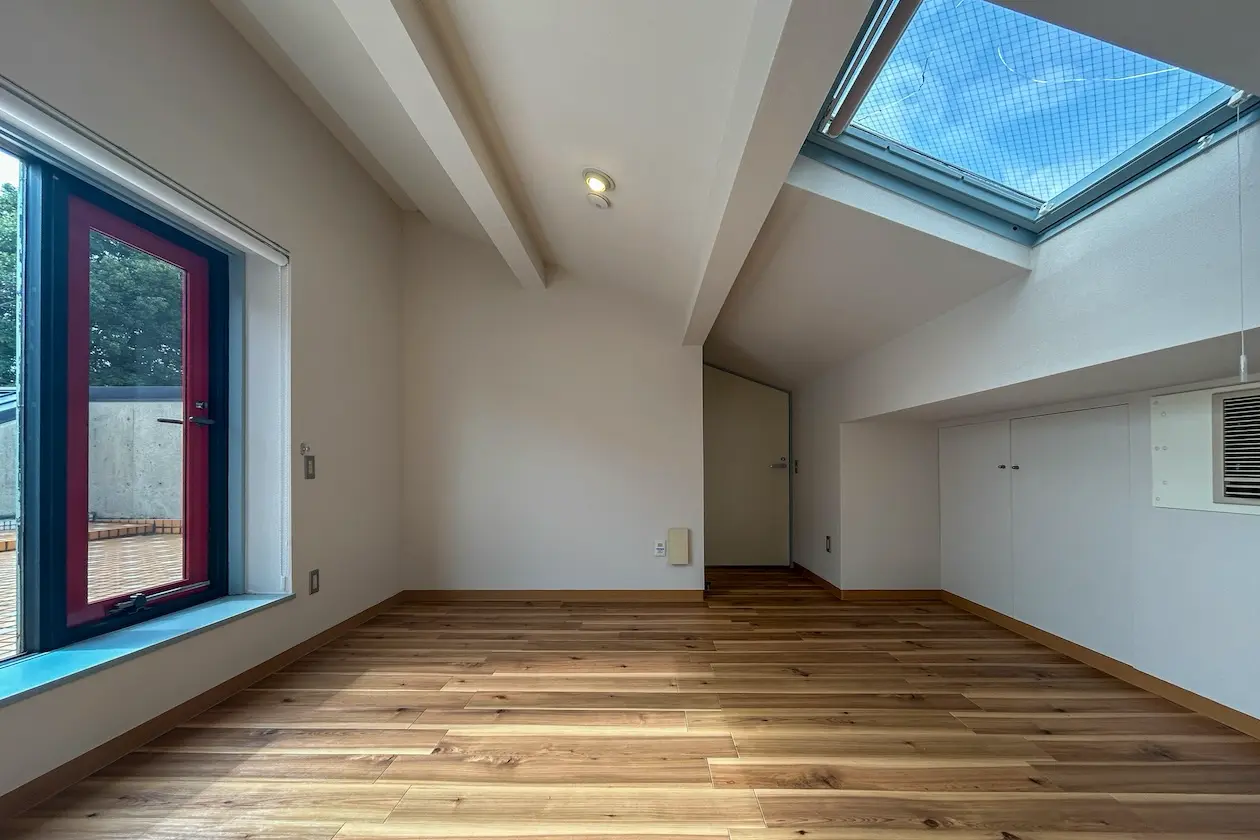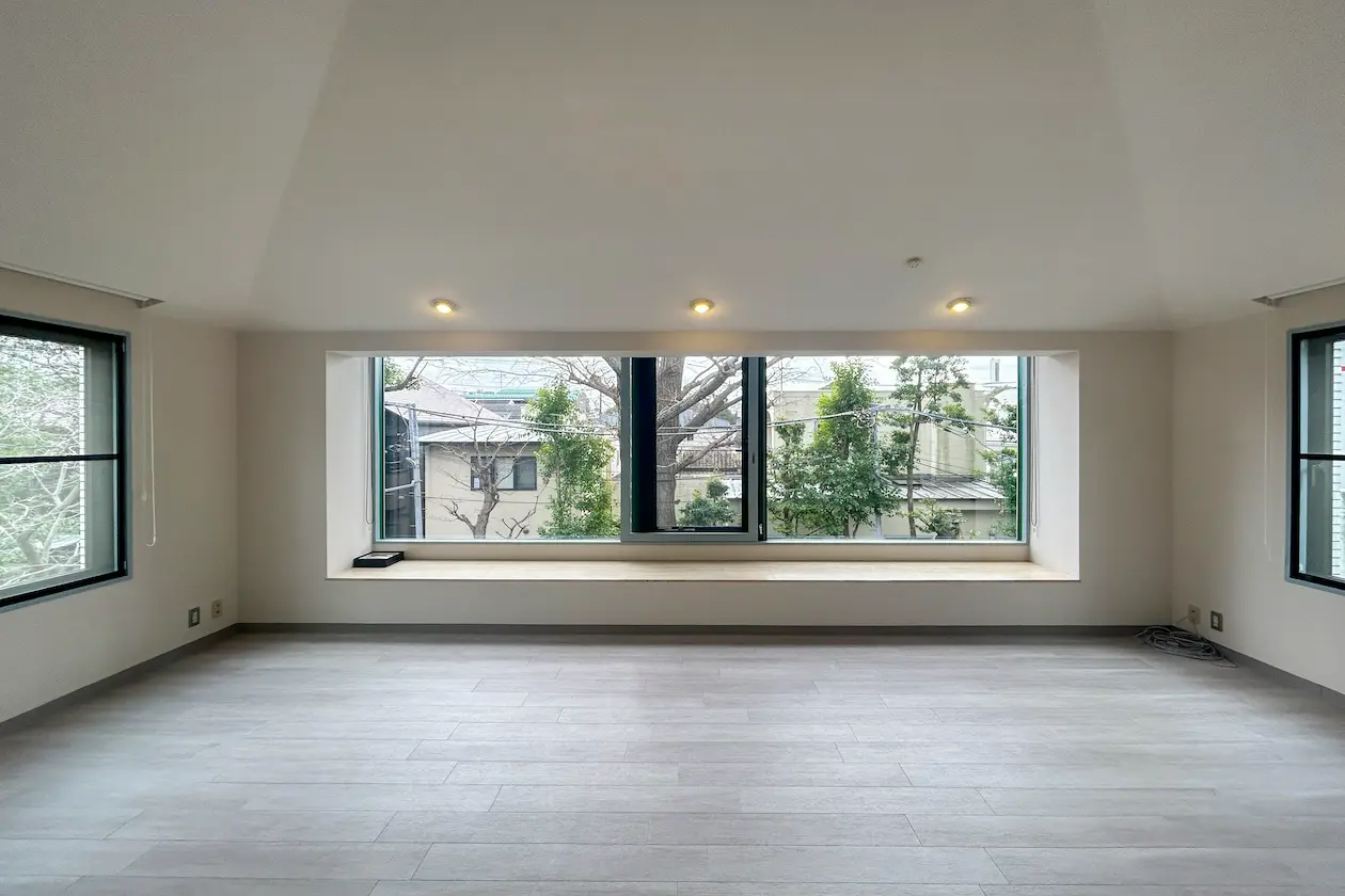 2階に上がると、ワイドな窓と天井から自然光がしっかり入り、雰囲気に柔らかさがある一室。窓の外はバルコニーが広がり、都心ながらも視線が抜ける開放感があります。