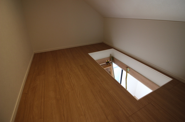 また、こちらの部屋には天井にロフトがつきます。棒を使って引っ張ると、ご覧の通り階段がでてきて上に登れるようになります。