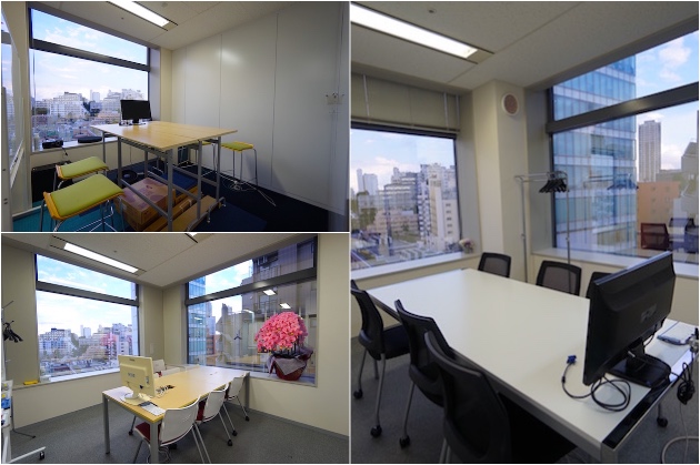 左下と右の写真が6名様用会議室。左上が執務室内の打ち合わせスペース。