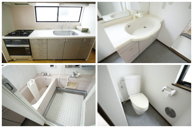 水回り。キッチンは2階、そのほかは1階部分に位置。住みながらの利用でも十分な機能が備わっています。