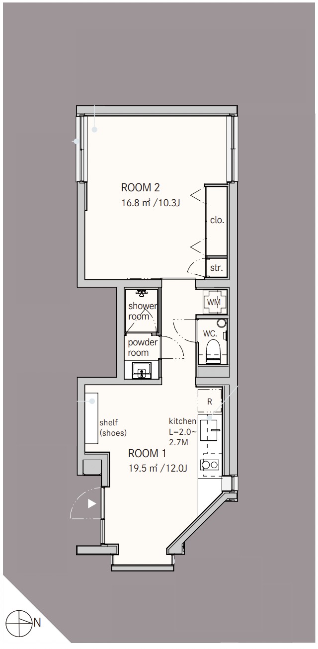 室内は約42㎡の広さ、手前にキッチンスペースを有する12帖のスペースと奥に10帖のスペースがある、用途で使い分けがし易い1LDKの間取りです。