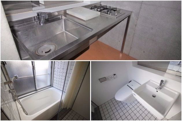 バスルーム・トイレは玄関から直接つながっています。キッチンは個別に設けられているのでワークスペースからは目につきにくく、コンパクトさ、デザインともに使いやすそうです。