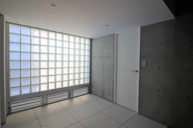 玄関の壁は全面ガラスブロックなので光が入り、明るい印象を与えます。両壁側にデスクを並べるレイアウトならば、採光をうまく使ったワークスペースができそうです。