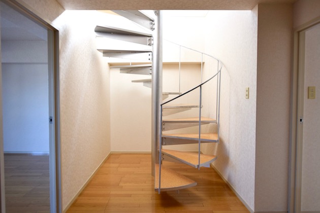 部屋の中心にある螺旋階段には上階からの光が差し込み、物件のアイコンになっています。