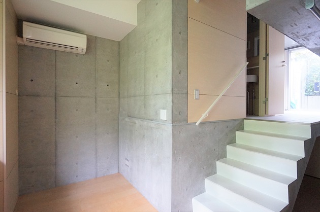 室内入ってすぐのスペース。シンプルながらも、ロフトの足場であったりコンクリートの壁面と床面の調和からデザイン性の高さがうかがえます。中央にテーブルを置いて作業スペースまたはミーティングスペースとするイメージが湧きました。1-2名でのスタートアップに適しているように思います。