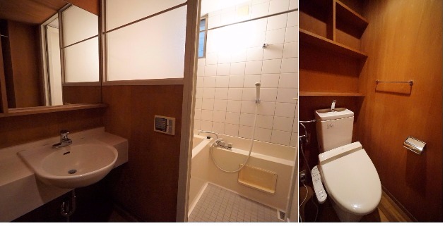 水回りは1階にあります。壁には木材に囲まれており清潔感を保ちつつビンテージな雰囲気を感じる空間。