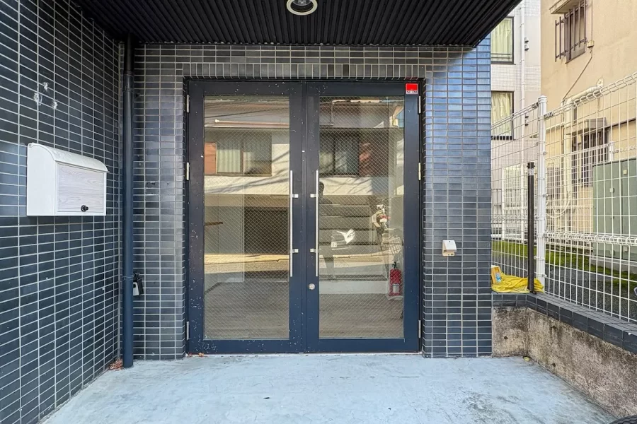 エントランスはくすんだ色味の青い外壁タイルに一般的な網ガラスのドアという組み合わせ。このままでも雰囲気はあるが鉄扉等で重厚感をプラスしても良いだろう。