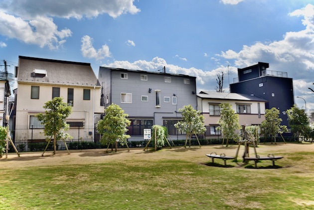 青山一丁目の駅から乃木坂方面へ5分ほど歩くと、青葉公園の芝生の向こうに今回の物件が見えてきます。