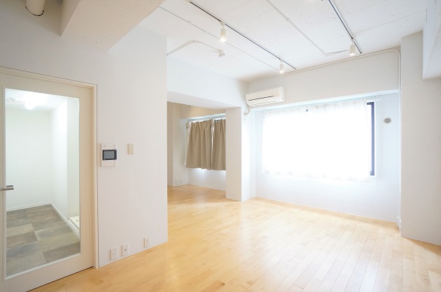 間切りの手前側キッチンのあるスペースが9.7帖、奥側のスペースが6帖ほどの広さです。手前をワークスペース、奥を居住スペースとするとレイアウトが考えやすそう。