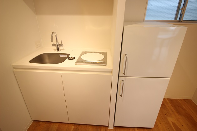 水回りはシンプルなつくり。またキッチン・冷蔵庫はブラインドで隠すことも可能。生活感を出したくない人には嬉しいポイントです。