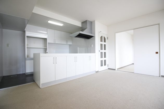部屋に入るとすぐに使い勝手の良いシステムキッチンがある。16.1帖の1LDK。