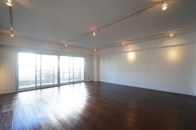 天井のライティングレールの照明と無垢フローリングがモダンな空間に仕上がっている。