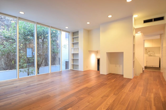 温かみのある木目のフローリングと細枠の窓のおかげで、明るく解放感のある室内です。