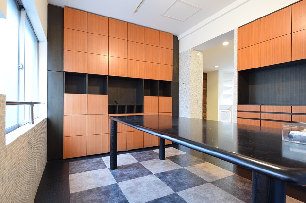 先ほどのリビングとはがらりと雰囲気が変わり、モザイクタイルや石材の床が、モダンな印象を与えます。