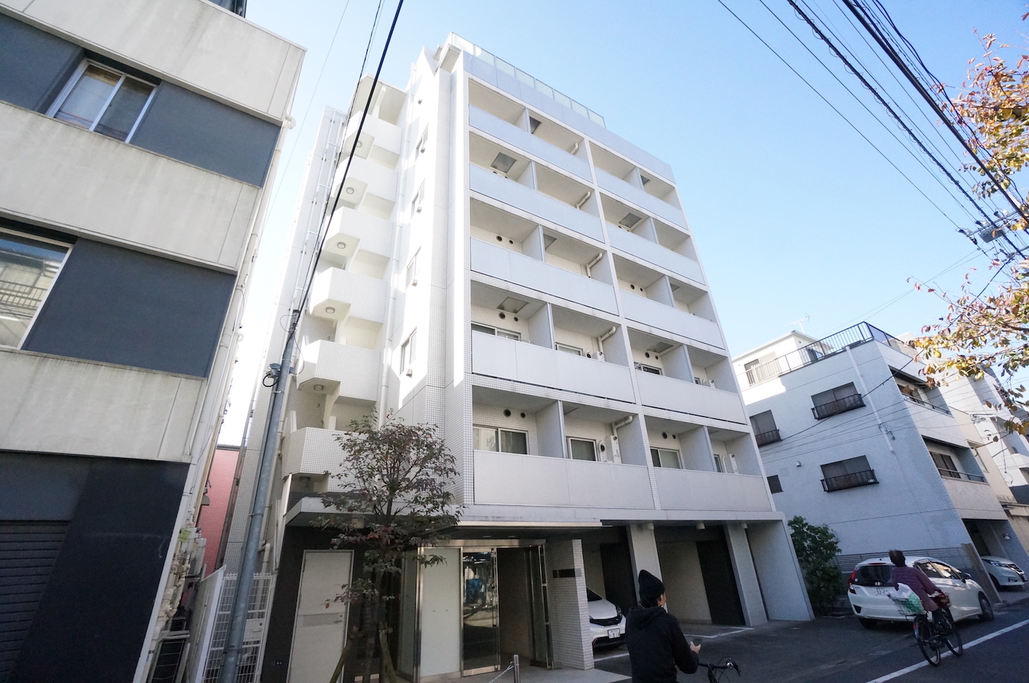 武蔵小山駅から商店街を抜けていくこと4分、シンプルに整えられた白を基調としたファサードが今回の物件。周囲の建物と比べると頭ひとつ抜けている。