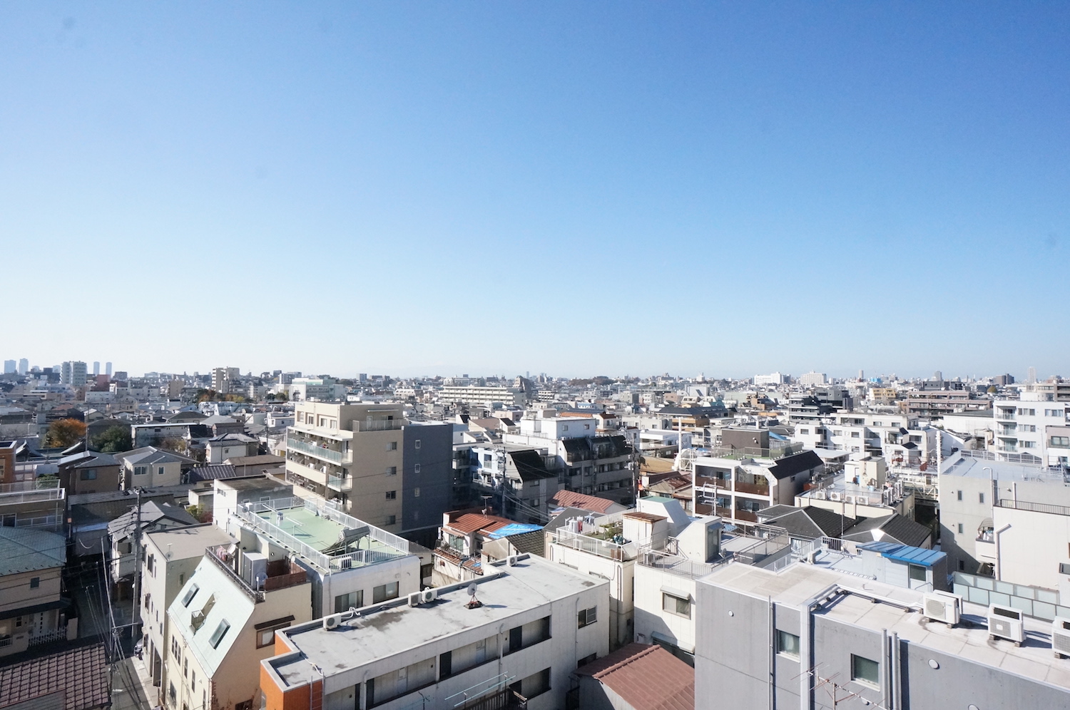 東京の住宅街と武蔵小杉のタワマン群、西側に目を移せば丹沢の山地と富士山もうっすらとその姿も確認できる最上階SOHOをご紹介しよう。