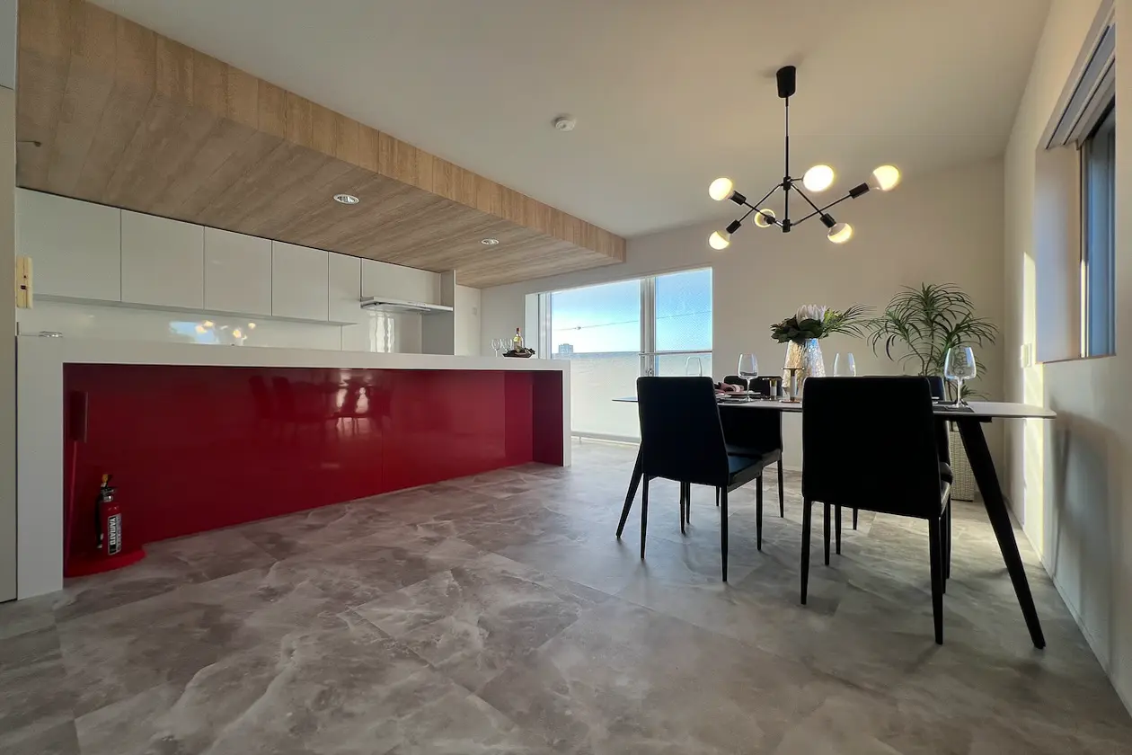 鮮やかな赤いカウンターが気になる場合は、リメイクシールを貼ることで気になることがなく、退去時に原状回復も行いやすそうです。