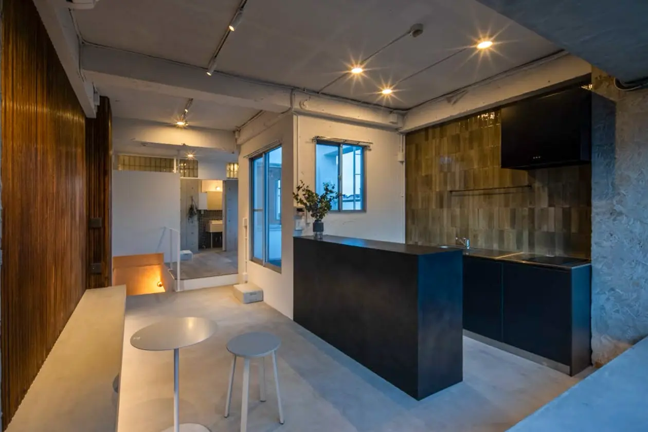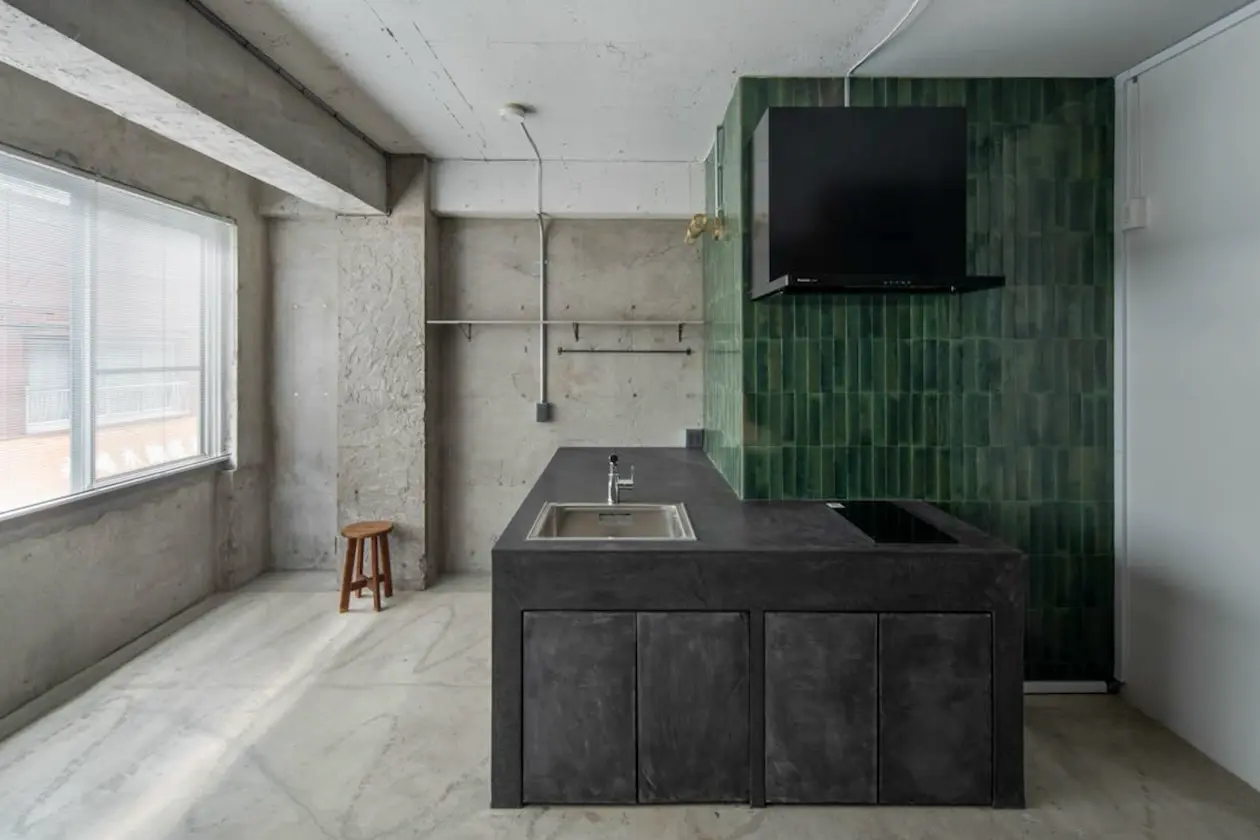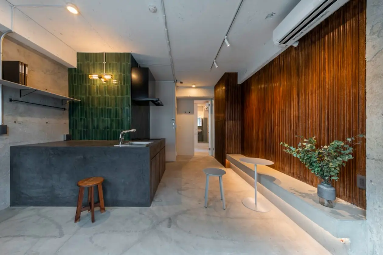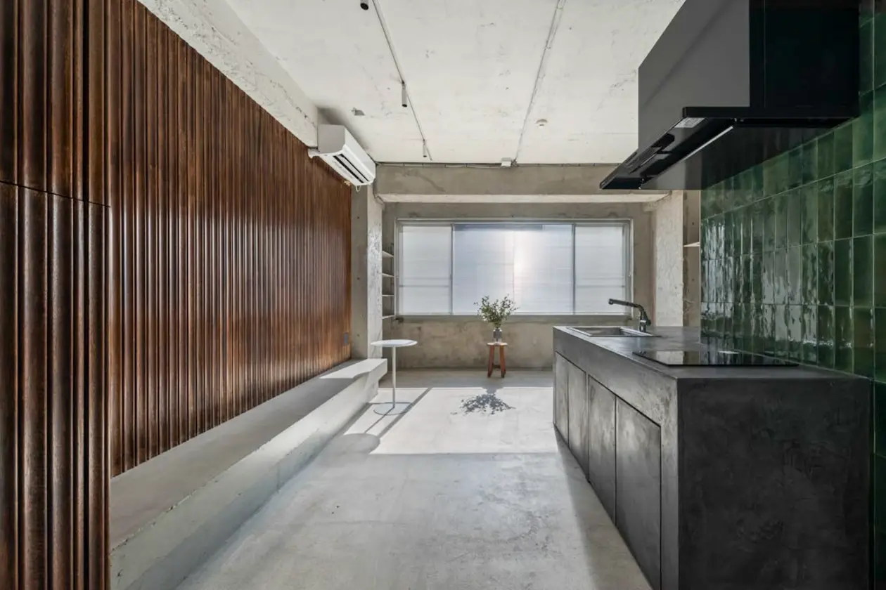 内装はコンクリート打ち放しをベースに、木の縦リブ壁とグリーンタイルを組み合わせた構成。無機質になりがちな素材感の中に、温度と奥行きを与えており、住居としての落ち着きと、商業・業務用途に耐える強さを両立しています。