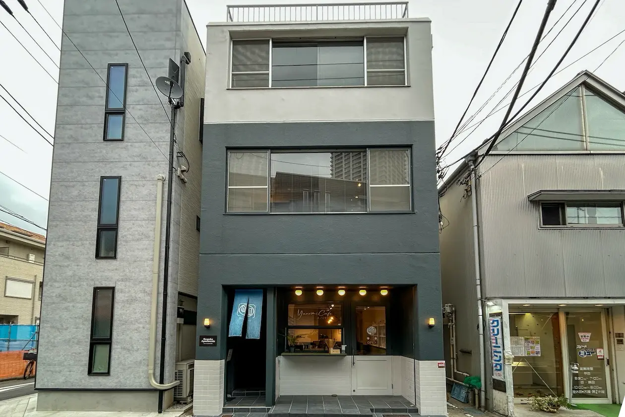 グレーを基調とした落ち着いたファサードに、1階部分はカフェがテナントとして入っており、街との距離感をほどよく保ちながらも視線を自然に引き寄せます。40㎡ほどのカフェスペースは、現在は譲渡料無しでカフェ内装の引き継ぎもご相談可能です。