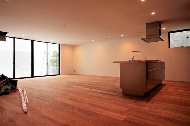 エントランスから少し階段を降りたところに位置するので比較的天井が高く、実際より広く感じる開放的な空間に仕上がっています。