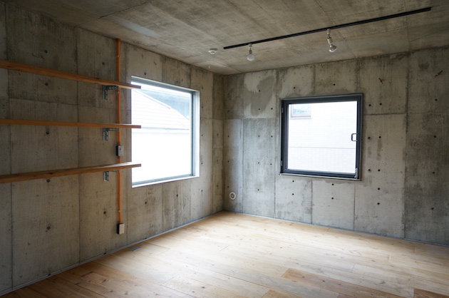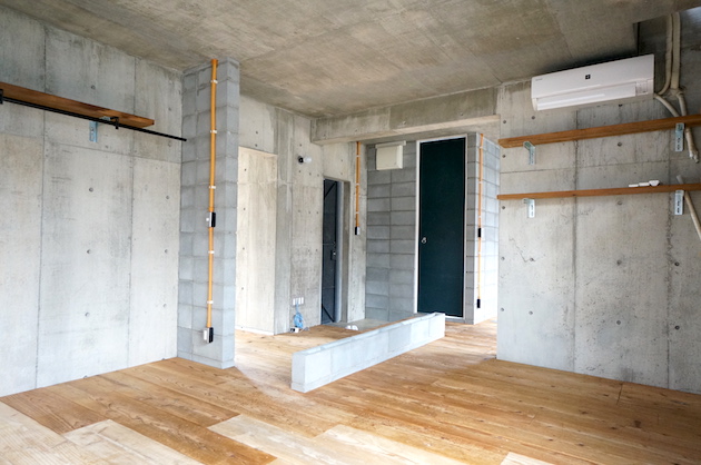 コンクリート打ち放しにフローリングという王道の要素にコンクリートブロックが良いアクセントになっています。