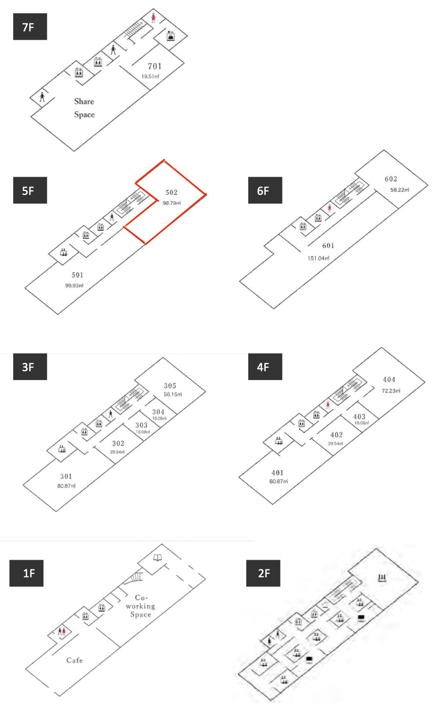 備考:賃料に電気料・空調料・インターネット利用料含む、コワーキングスペース(月額 ¥18,000/人)・シェアスペースの固定席(月額 ¥50,000/2席、¥100,000/4席)のオプションプラン有