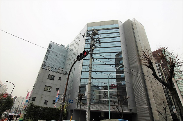 正面はガラス張りでオフィスビルらしい外観。大通りに面し視認性も高いです。