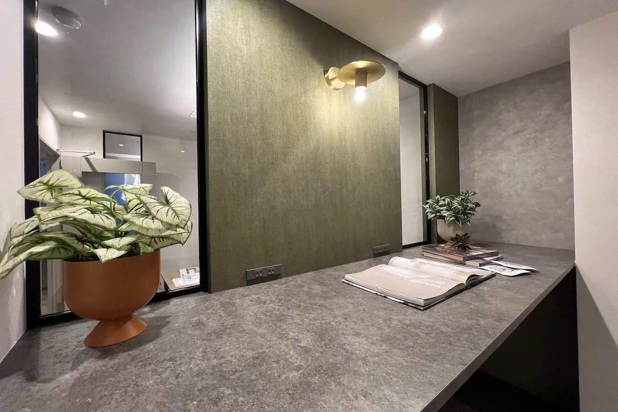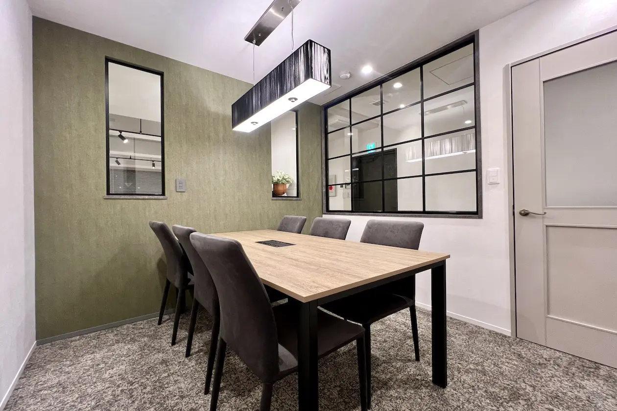 柔らかいグリーンのクロスや照明など、落ち着いた雰囲気で来客対応やミーティングしていただけそうです。