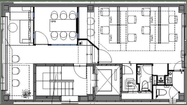 執務室はゆったりとしたサイズ感。ラウンジのヘリンボーン床から、タイルカーペットへ。オフィスとしての利便性もありながら、テーマカラーである上質なグリーンで安らぎを感じる空間となっております。