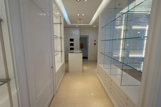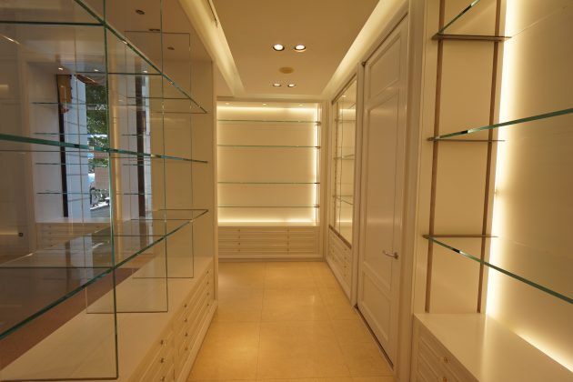 造作されたガラス棚とライティングが、一層洗練された雰囲気を引き立てている。
