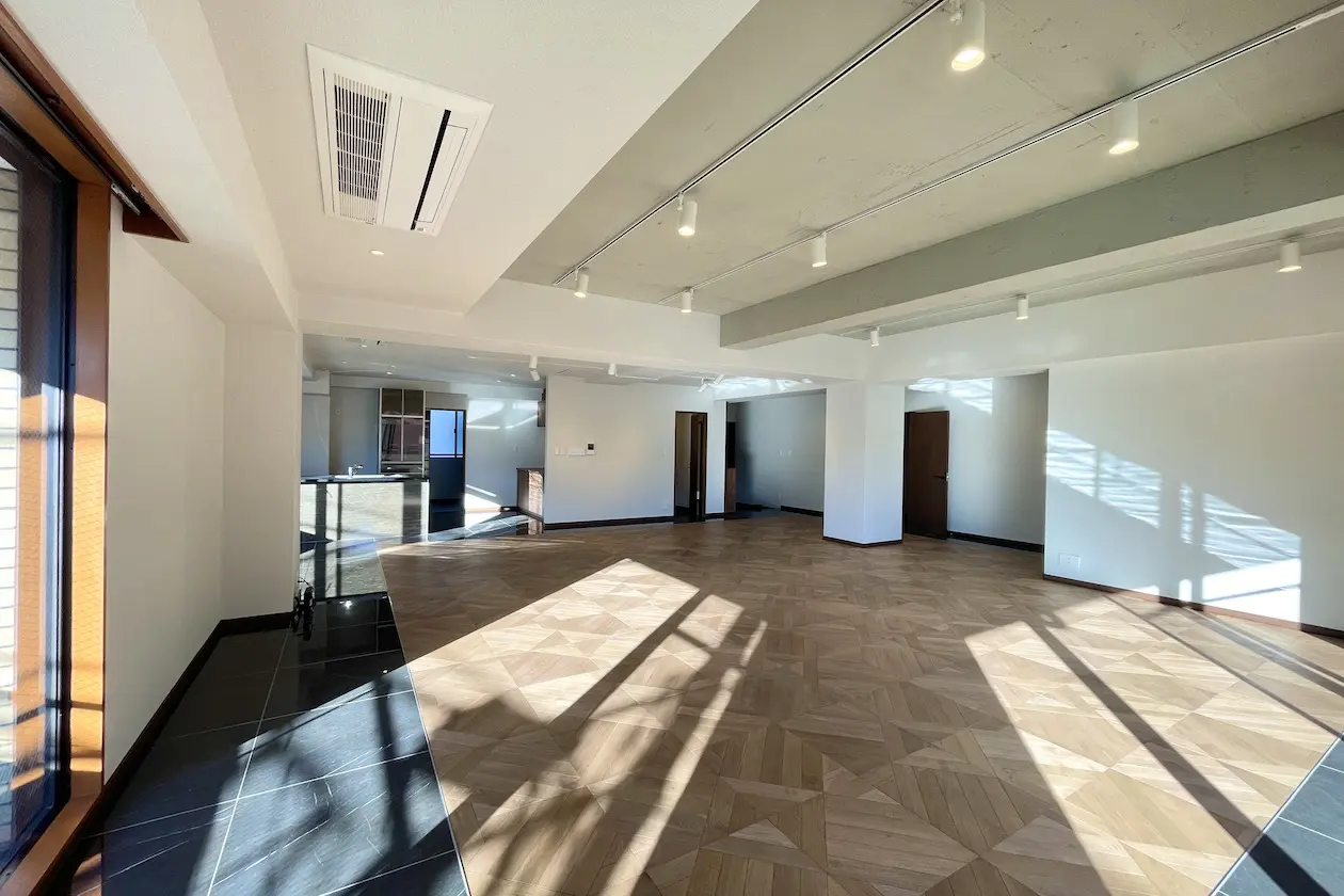 リビングの隣には8人ほどのスペースがあります。グレージュのフロアタイルをベースにウッド調の内装に仕上がっています。