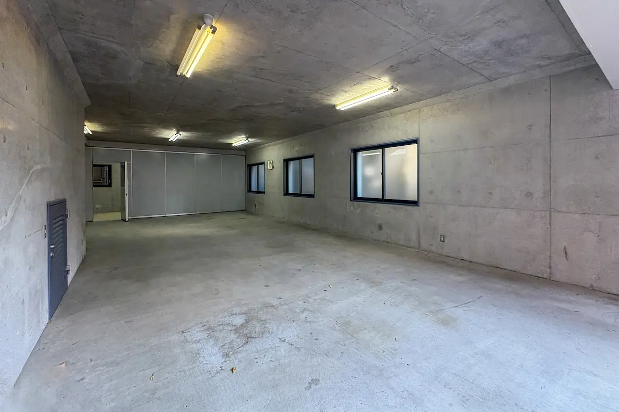 1階のシャッターはガレージとして利用でき、一棟オフィスならではのプライベート性と機能性を兼ね備えたつくり。