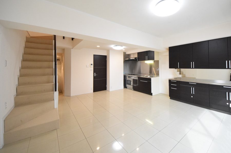 玄関を入るとすぐに広がるLDK。光沢のある石の床は、高級感があり来客の際も自信をもって招待できそうです。