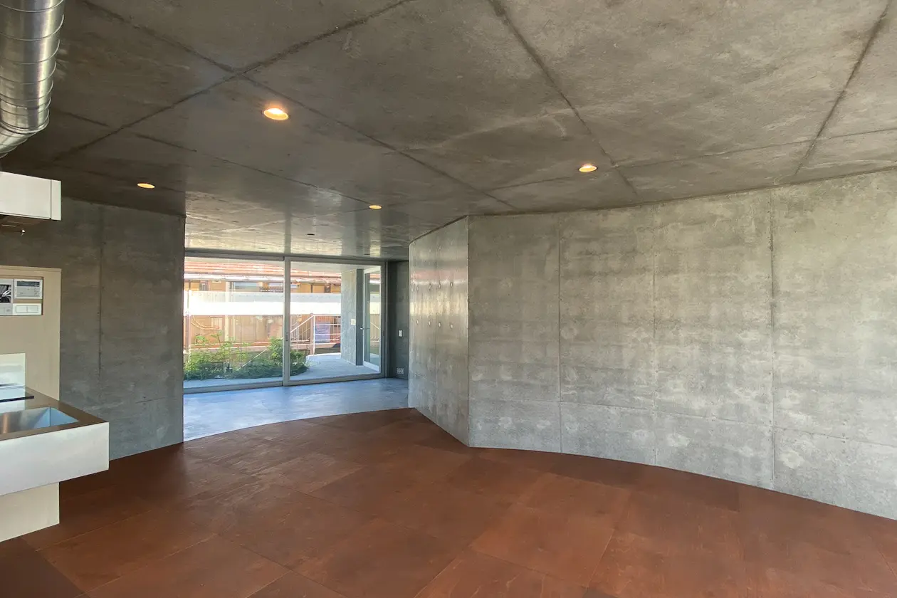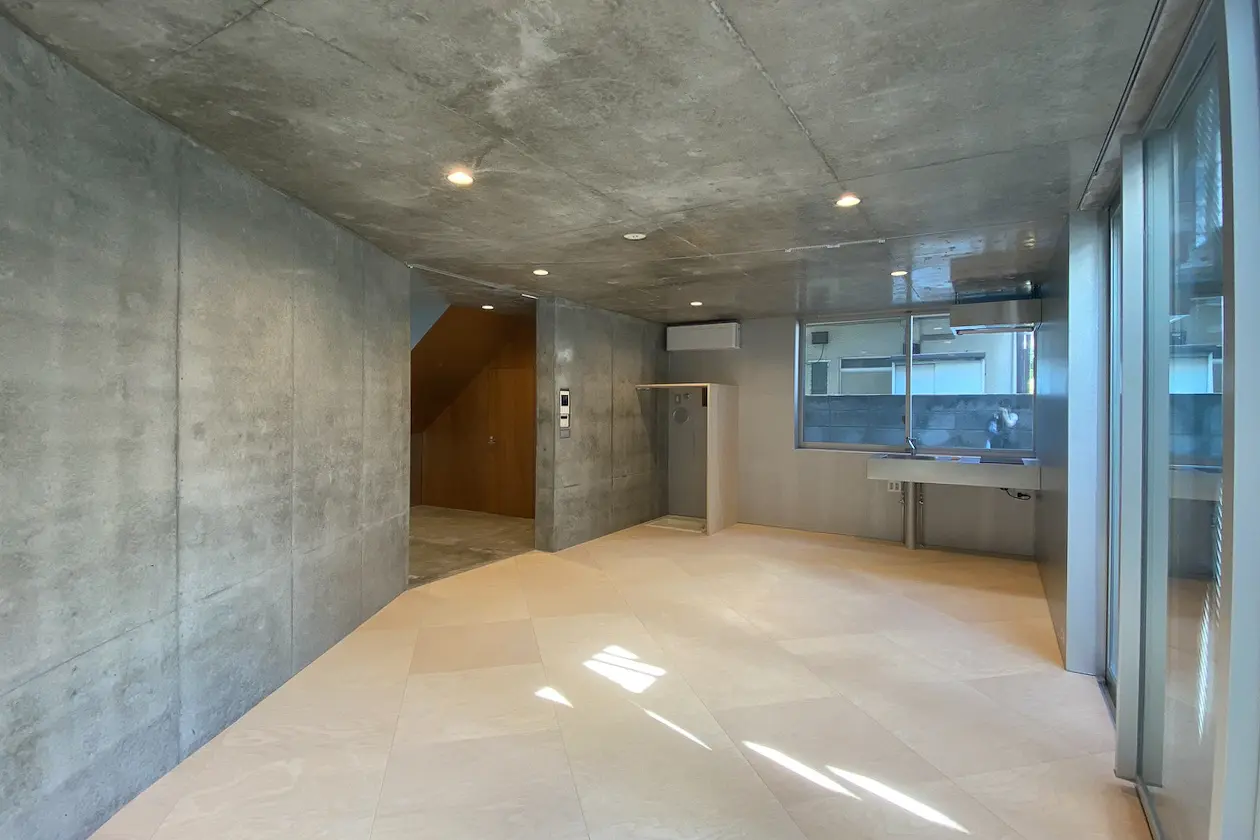 こちらは2階区画、タイルフロアとモルタル床の切替わりによって空間を分けて利用することが可能。