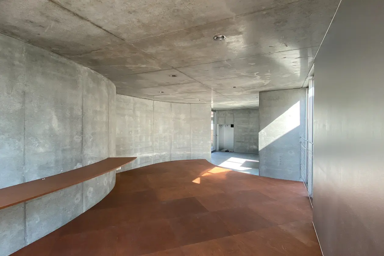 美しい曲線を描くコンクリートのファザードが芸術的な印象を与えるオフィス。
