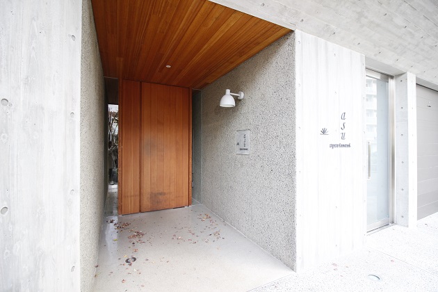 エントランス部分にも木材が使われており、ナチュラルかつスタイリッシュな雰囲気。デザイナーズ物件ならではの拘りが見えます。