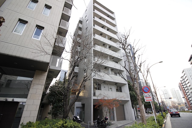 大通り沿いにあるホワイト一色の10階建て。エントランス前にある木々は季節によって色づきが変わり、四季折々楽しめそうです。